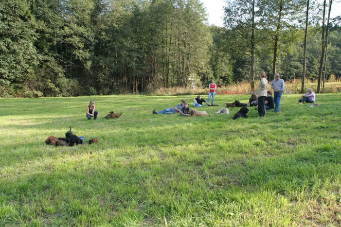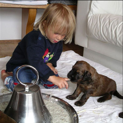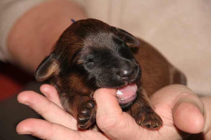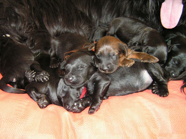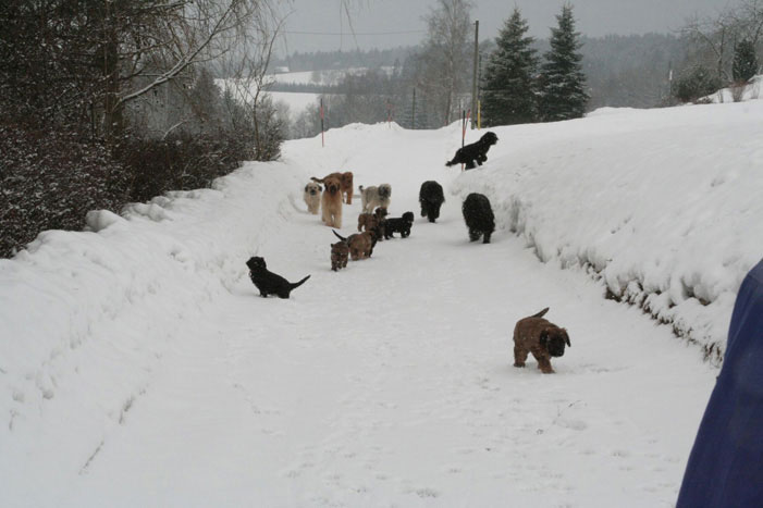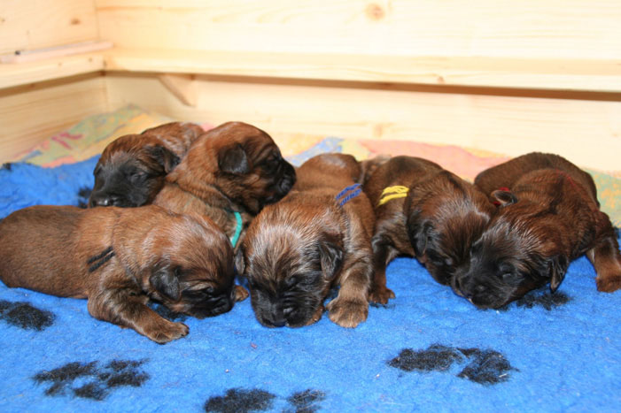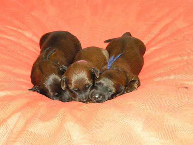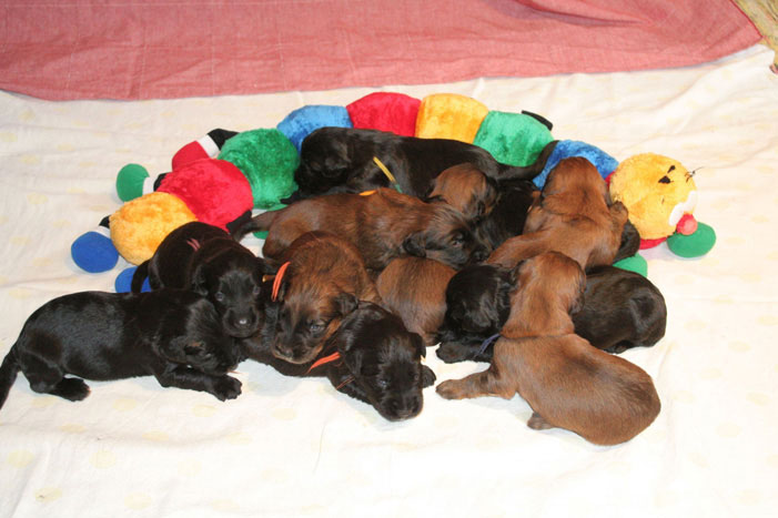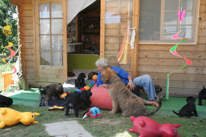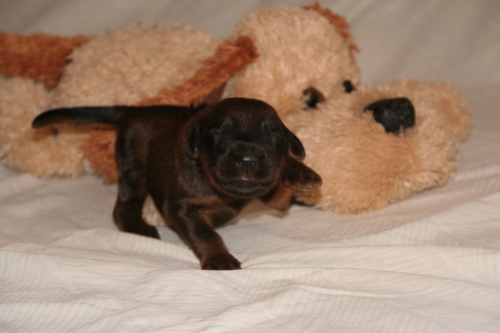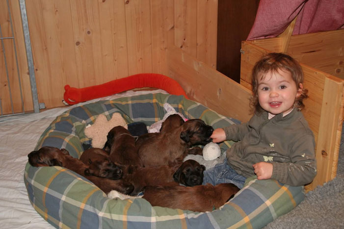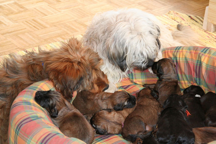 Wenn unsere Hündinnen ihre Welpen haben, bedeutet das acht Wochen positiver Dauerstress für uns. Angefangen von der "Rund-um-die-Uhr-Betreuung" in der ersten Lebenswoche der Welpen, bis acht Wochen später zur Abgabe in ihre sorgfältig ausgesuchten Familien. In der Zwischenzeit dürfen unsere Welpen glücklich unser Leben "umkrempeln". Kein Tag vergeht ohne Spielen, Fressen, Kuscheln und natürlich Lernen. Um hiervon einen Eindruck zu bekommen einfach das entsprechende Vorschaubild anklicken und es erscheint im Großformatdann in einem neuen Fenster.