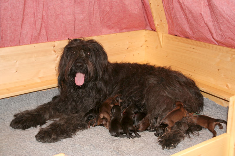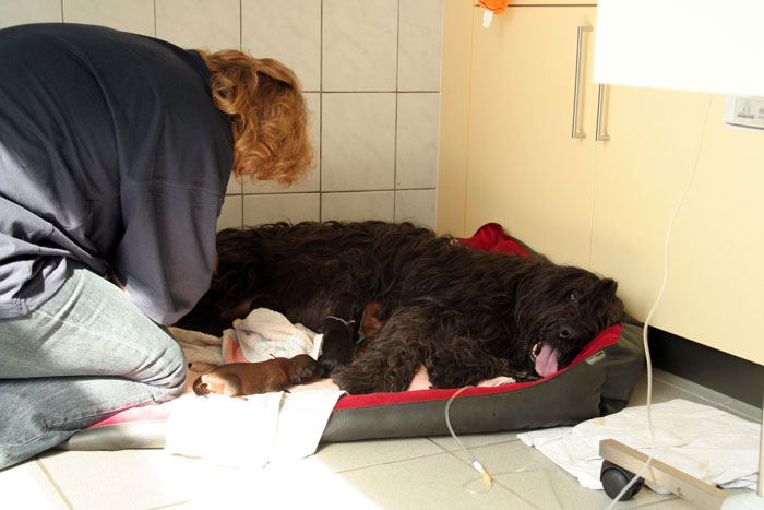 Leider mussten wir, nachdem Morgaine trotz heftigster Wehen und Pressen in fünf Stunden nur zwei Welpen bekommen hat, zum Tierarzt fahren. Frau Dr. Siegrun Lauböck, die ungeachtet aller Widrigkeiten dann schnell alle Termine verlegt und einige schon anwesenden Patienten versorgt hat, war dann bis zum Nachmittag mit ihrem Team nur für Morgaine und uns da - ein unendlich großes Dankeschön an das kompetente und supernette Praxisteam.