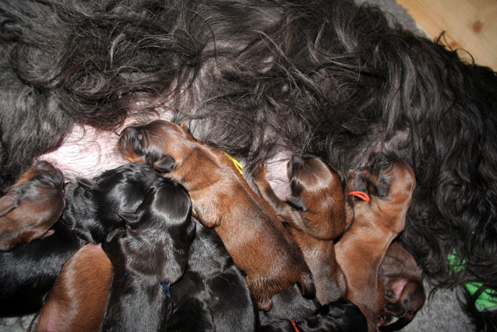 Wir kamen dann, nach mühevollen sieben glücklicherweise putzmunteren Welpen, doch nicht um einen Kaiserschnitt herum. Fünf Hexlein haben noch geduldig gewartet, bis auch sie endlich 'Praxisluft' schnuppern durften und gesund und munter sich zu den anderen gesellten. Andrea und ich, nebst 'Leeloo' Claudia, die tatkräftig bei allen Handlungen geholfen hat, sowie das Praxisteam waren mehr als erleichtert, als Morgainchen und ihre zwölf Kinder rundum versorgt waren und alles supergut verlaufen ist.