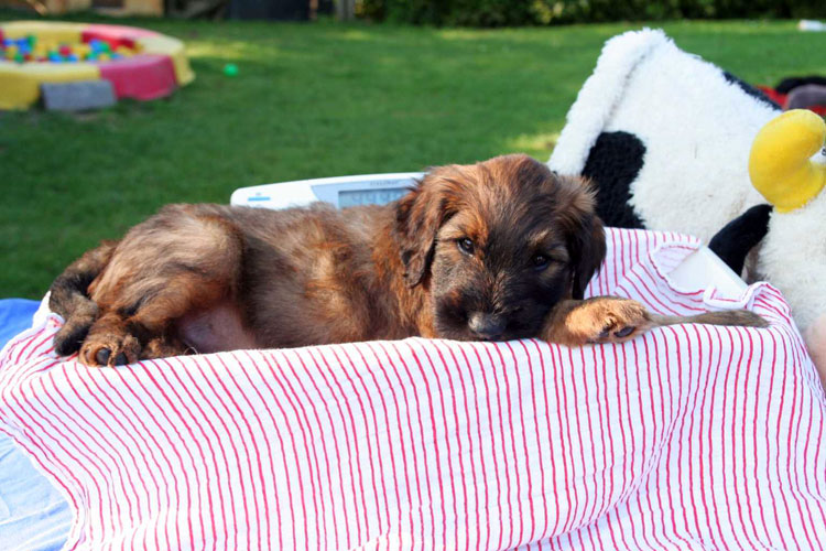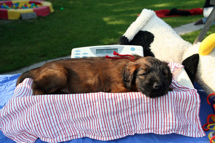 Das wöchentliche Wiegen können wir nur noch wagen wenn sie 'ins Koma gefallen' sind, ansonsten springen sie auf der Waage derart umeinander, dass eine Gewichtskontrolle eher einer Schätzung gleicht. Sie haben augenscheinlich das Temperament von Papa Gambler geerbt und Morgainchen ist schier fassungslos über soviel Energie ihrer Hexenkinder. Nach wie vor dürfen die Mini Monster bei ihr trinken, auch wenn sie es so geschickt einfädelt, dass nicht alle mitbekommen wenn die 'Milchbar' freigegeben ist. Alle zwölf gleichzeitig am Gesäuge zu haben ist dann doch ein wenig zuviel der Liebe.