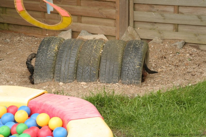 Begeistert haben sie alles in Beschlag genommen. Zunächst noch mit Inschi, Onawa, Cobold und uns gemeinsam, aber mittlerweile rennen sie in dem großen Gehege alleine umeinander und überlegen offensichtlich schon, was sie so alles neu ordnen könnten. Unsere kleine Cobold steht immer staunend am Gitter und ihr größtes Glück ist es, wenn sie unter Aufsicht mit ihnen laufen darf. Unsere Hexlein finden sie etwas grobmotorisch aber ansonsten ganz nett, und lassen sie ab und an auch mal mitspielen.