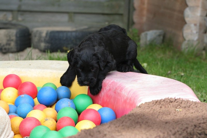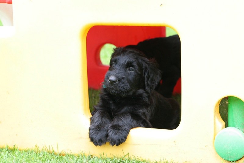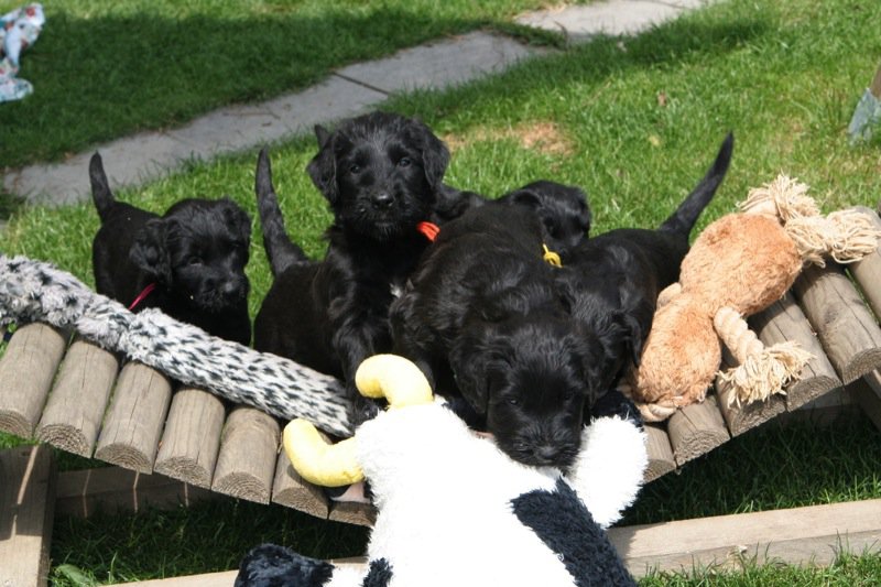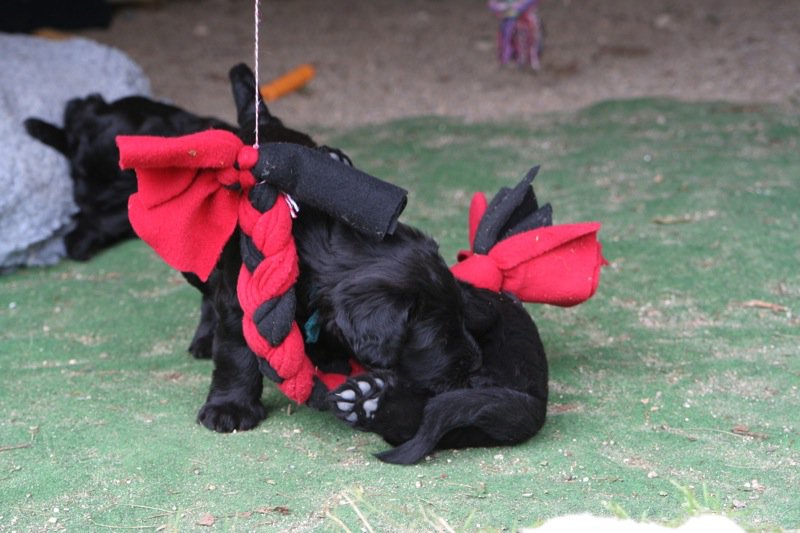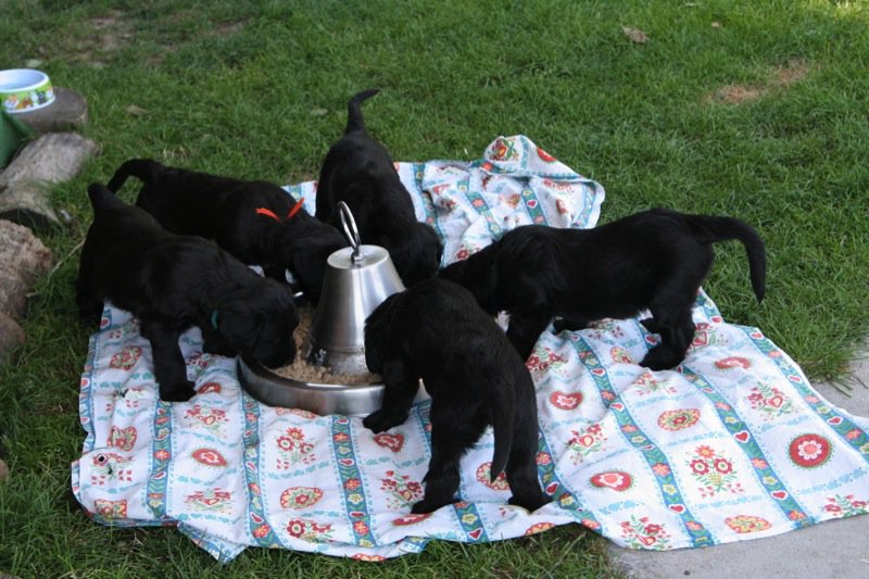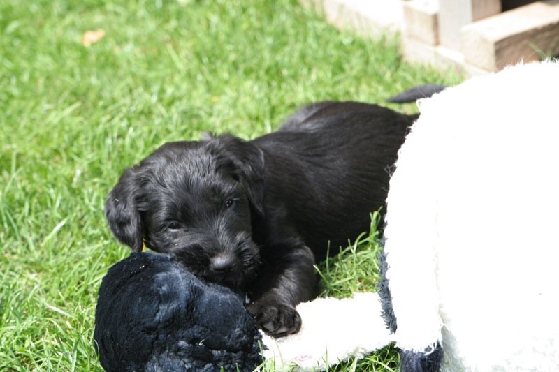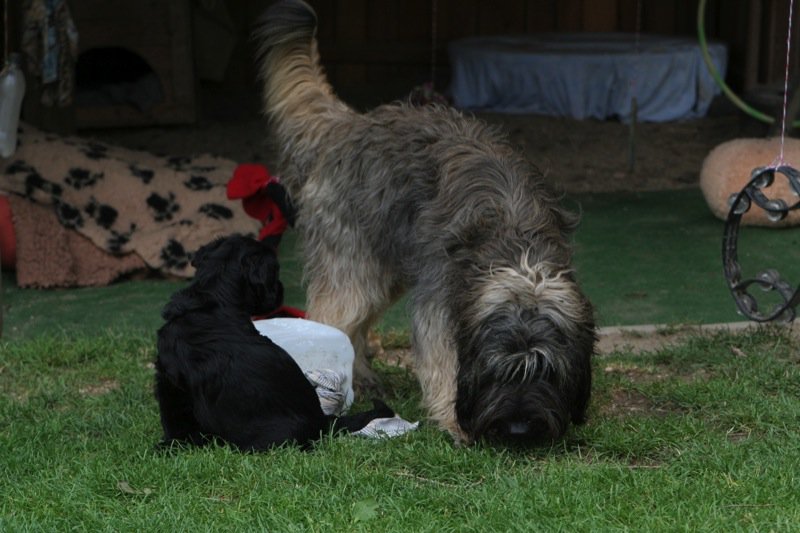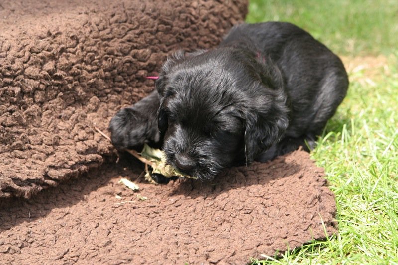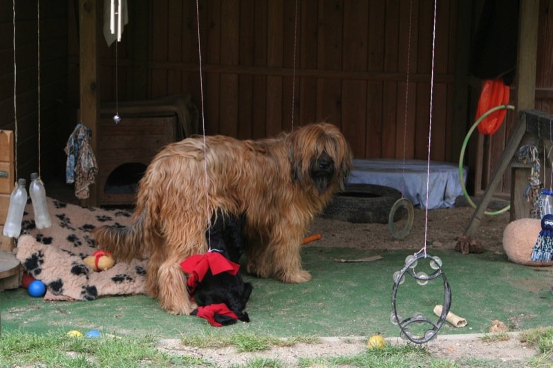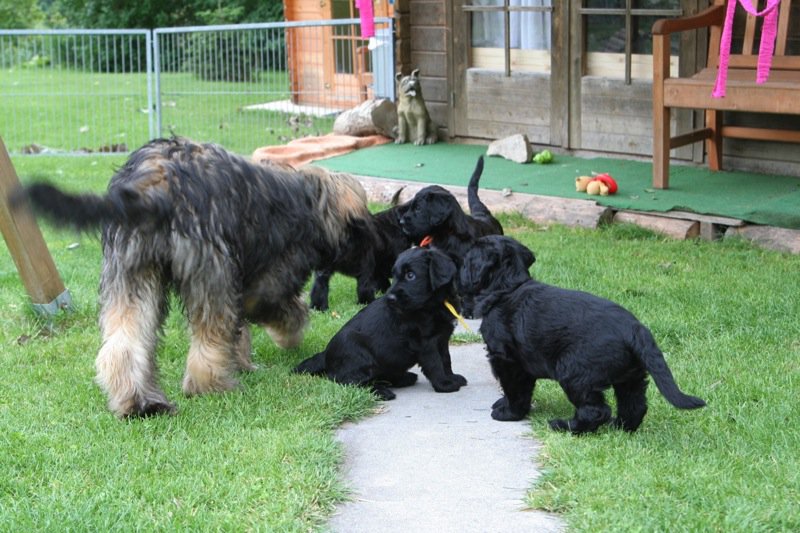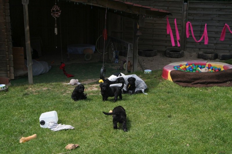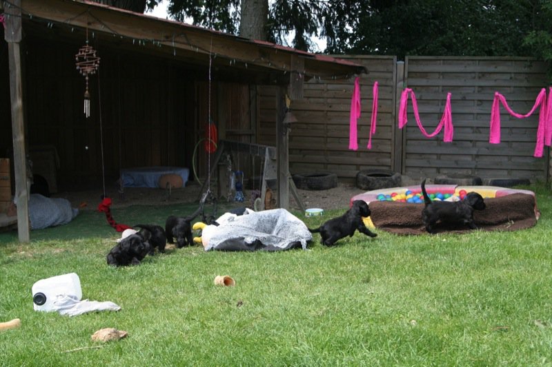 Unsere gloreichen Fünf haben ihr erstes Unwetter schlichtweg verschlafen. Hier stürzten Bäume um, der Wind fegte alles, was nicht niet- und nagelfest war durch den Garten ... und unsere Hexlein lagen wohlig schlafend unter dem Vordach auf den Kuscheldecken. Na gut, Sturm tut ihnen augenscheinlich nichts. Den Wasserfall, der sich dann in ihren Garten ergoss, fanden sie überaus witzig. Mit hoch erhobener Rute trauten sie sich an den 'reißenden Fluss' und begannen fröhlich zu trinken. Die eine oder andere wollte glatt auch noch baden, was ich dann aber kurz entschlossen verhinderte und sie alle klatschnass ins Welpenhaus trug. Augenscheinlich sind sie weder Wasser noch Windscheu.
