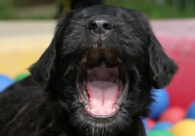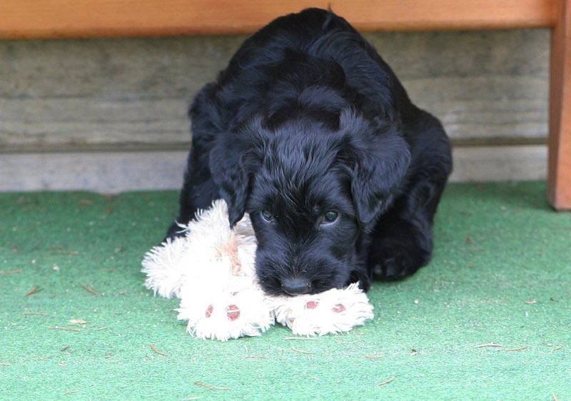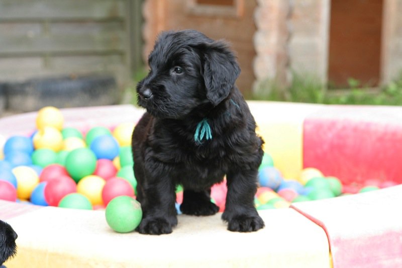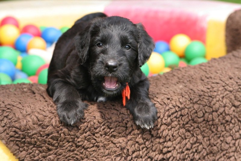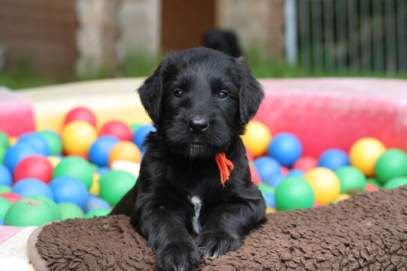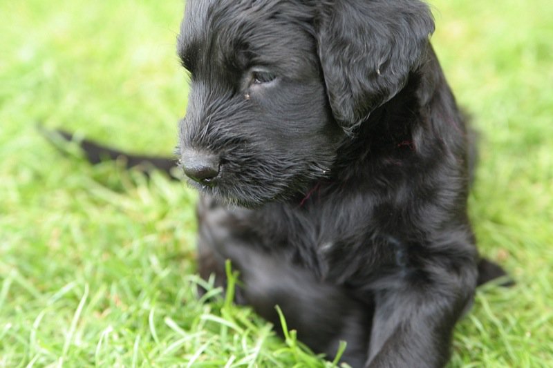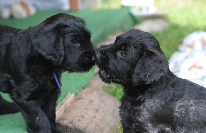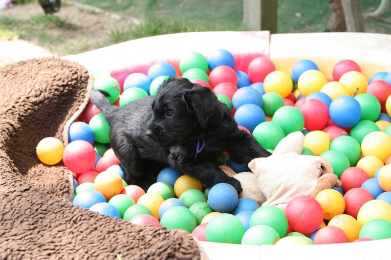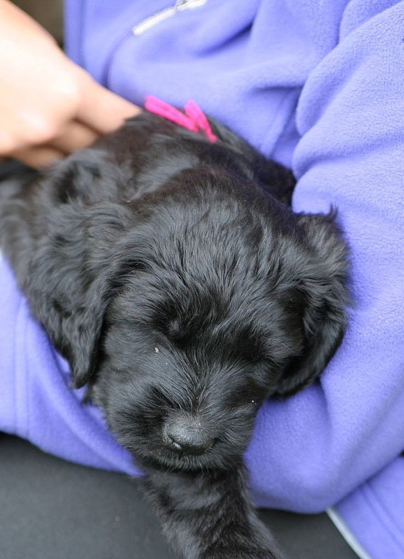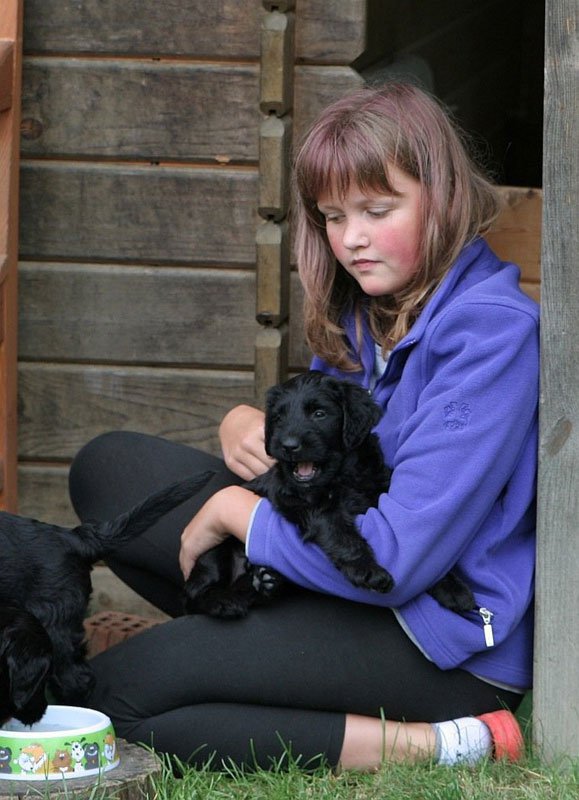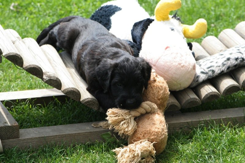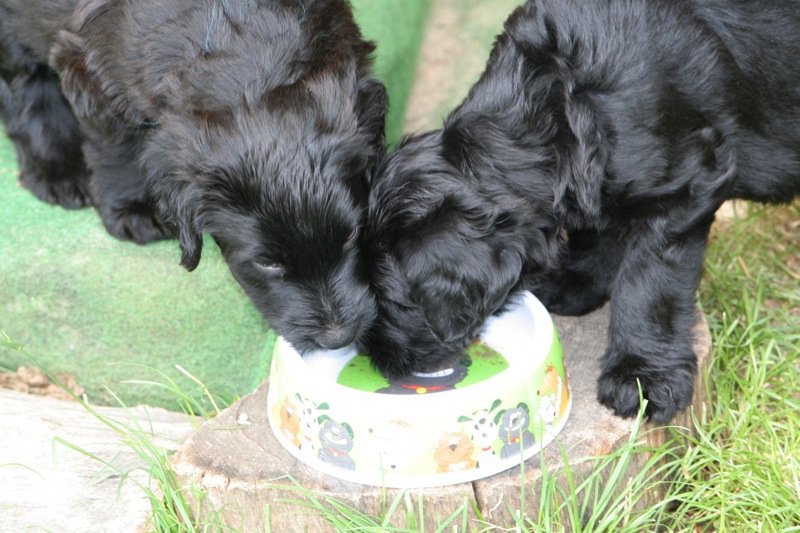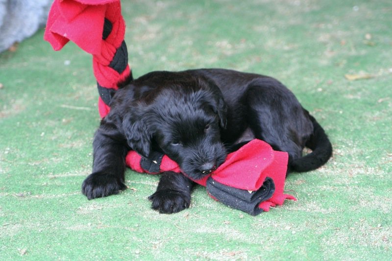 Unsere gloreichen Fünf haben ihr erstes Unwetter schlichtweg verschlafen. Hier stürzten Bäume um, der Wind fegte alles, was nicht niet- und nagelfest war durch den Garten ... und unsere Hexlein lagen wohlig schlafend unter dem Vordach auf den Kuscheldecken. Na gut, Sturm tut ihnen augenscheinlich nichts. Den Wasserfall, der sich dann in ihren Garten ergoss, fanden sie überaus witzig. Mit hoch erhobener Rute trauten sie sich an den 'reißenden Fluss' und begannen fröhlich zu trinken. Die eine oder andere wollte glatt auch noch baden, was ich dann aber kurz entschlossen verhinderte und sie alle klatschnass ins Welpenhaus trug. Augenscheinlich sind sie weder Wasser noch Windscheu.