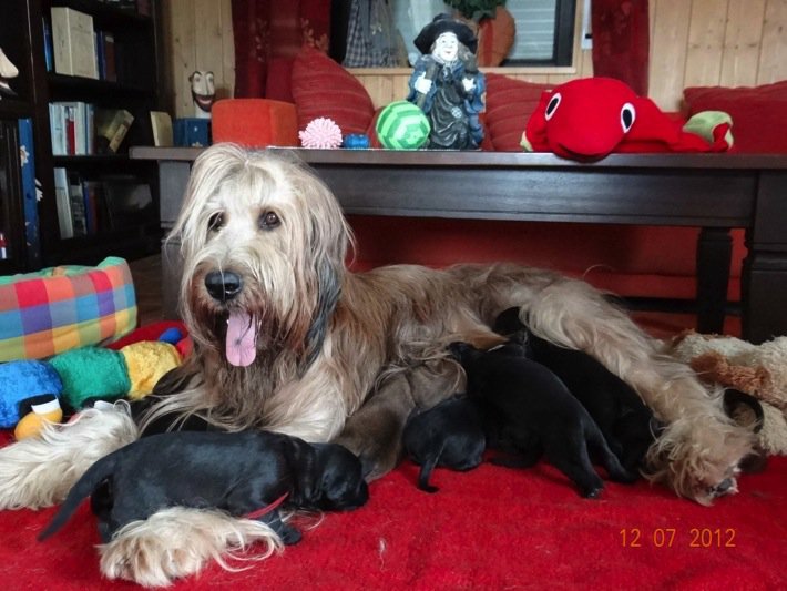 Cobold und Urmel schleichen sich schon immer näher und dürfen als Einzige die Babys ganz nah beriechen. Alle anderen kommen zwar mittlerweile ins Wohnzimmer aber nur mit gebührendem Abstand zu den Welpen. Cobold, die hoffentlich auch bald Babys bekommt, ist schon ganz im Glück ... sie durfte schon in die Wurfhöhle und alle ein wenig bestupsen und wild bewedeln.
