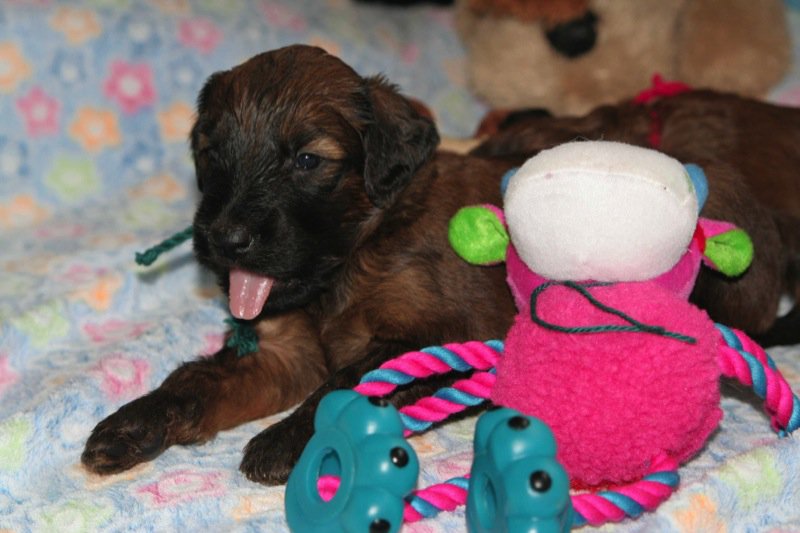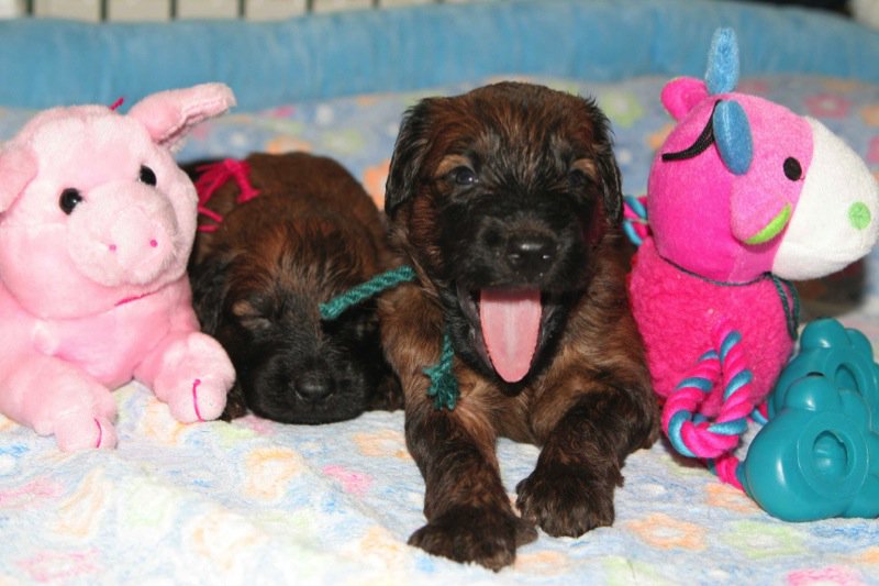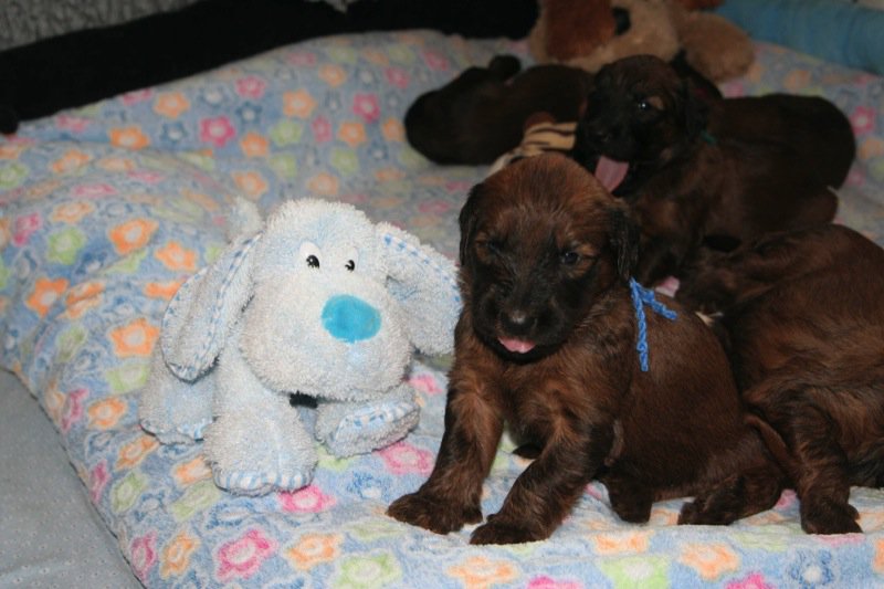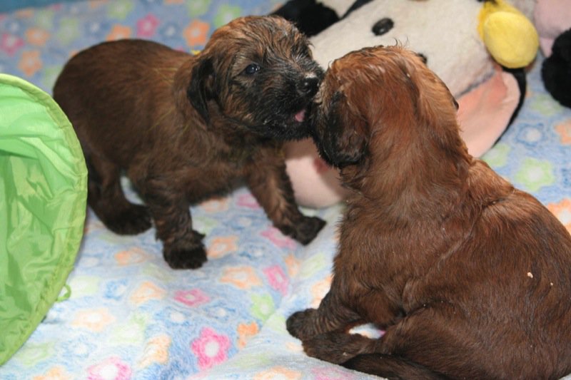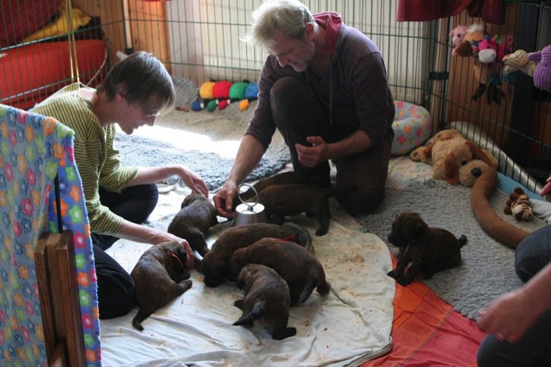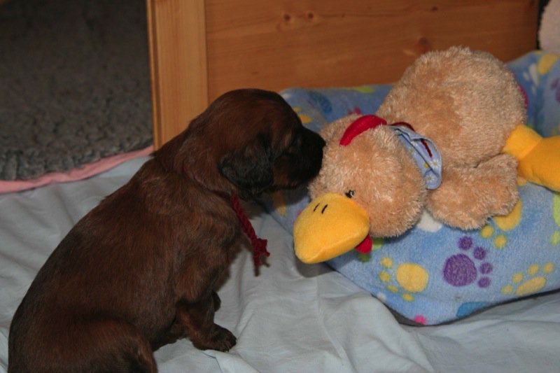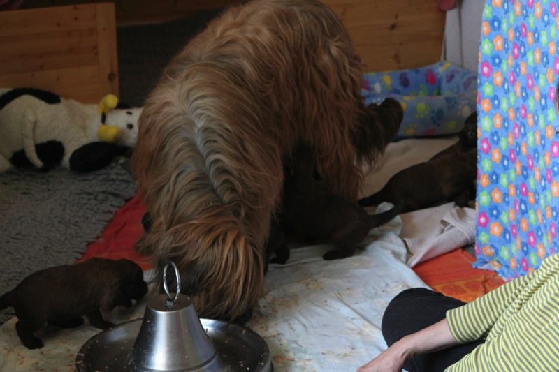 Wir genießen wie sie ihre Welt entdecken und jetzt täglich neue Dinge lernen und ausprobieren. Mara liegt jetzt häufiger außerhalb des Wohnzimmers, so dass unser restliches Rudel die Welpen inspizieren. Besonders unsere Gossos finden die kleinen Hexlein überaus spannend.
