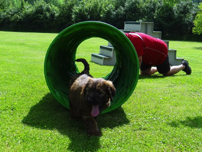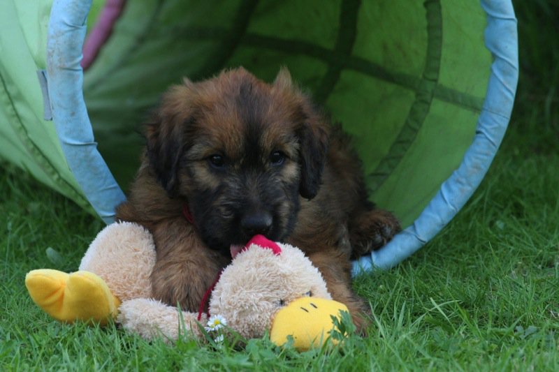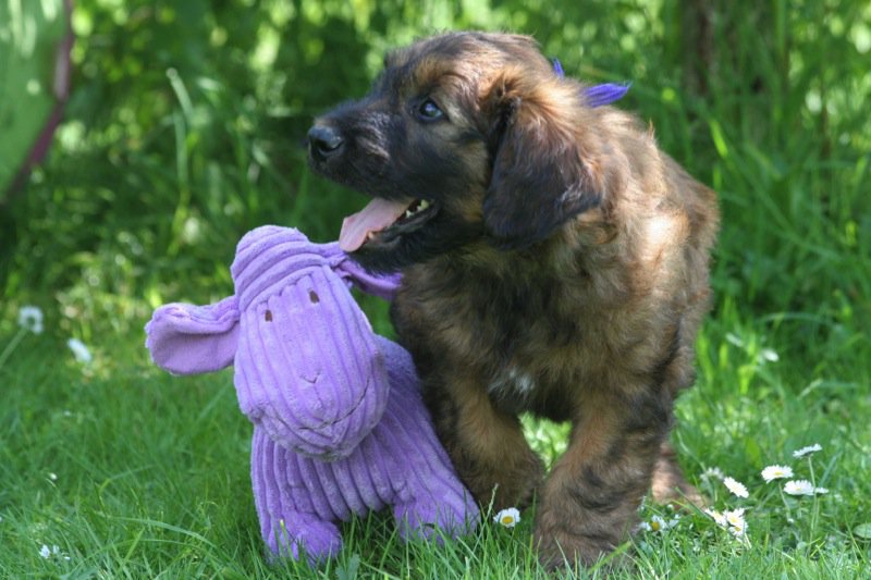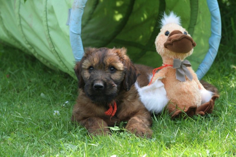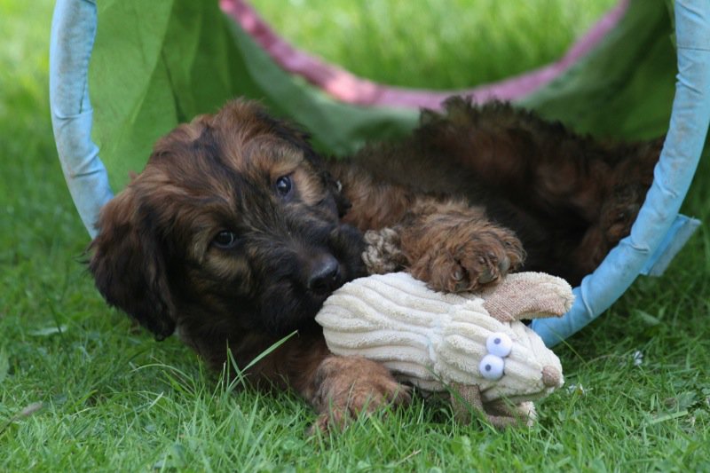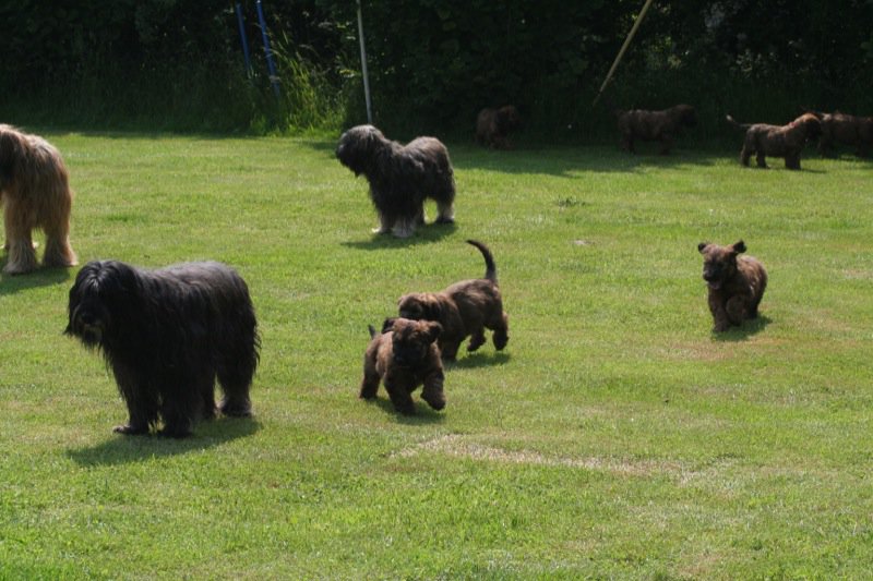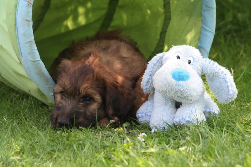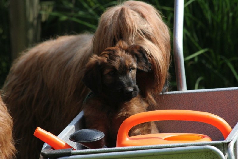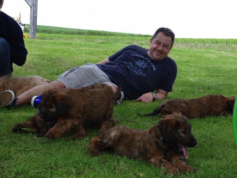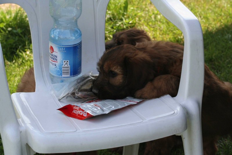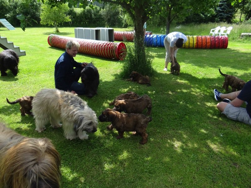 Es sind sehr kontaktfreudige, weltoffene Welpen. Alles Neue wird begeistert mitgemacht, selten zeigen sie Angst. Selbst der Trecker wird, wenn auch mit etwas Abstand, neugierig beäugt. Und dem kleinen Rasenmäher jagen sie furchtlos hinterher.