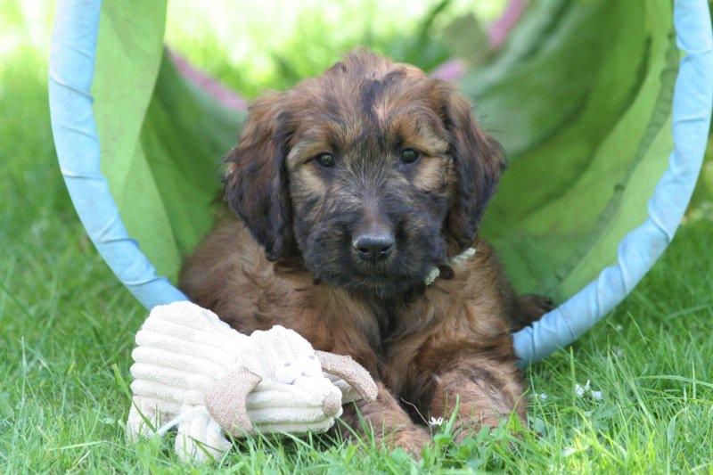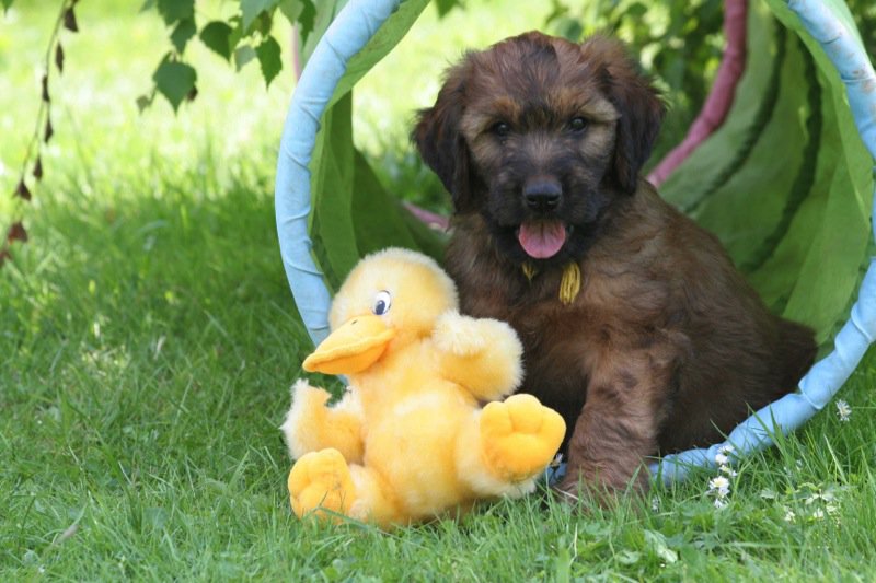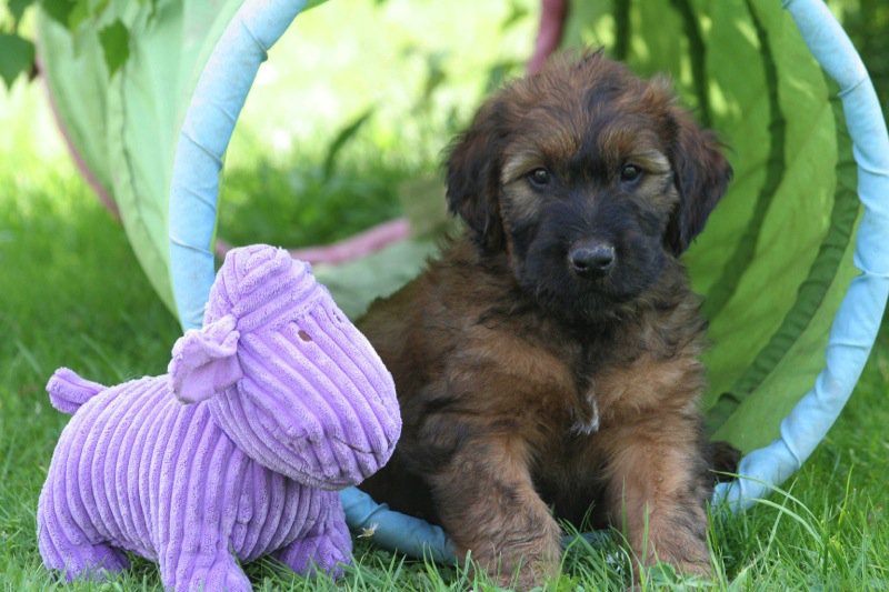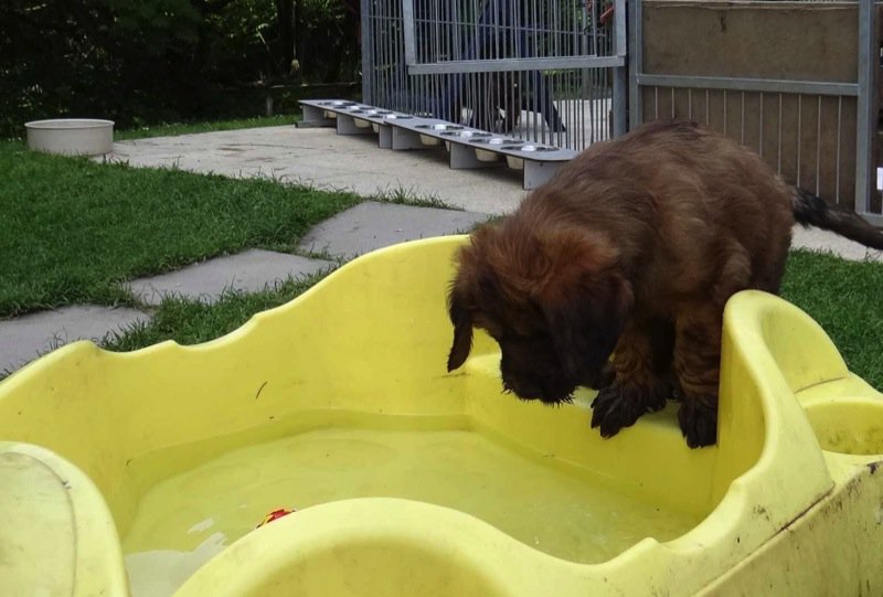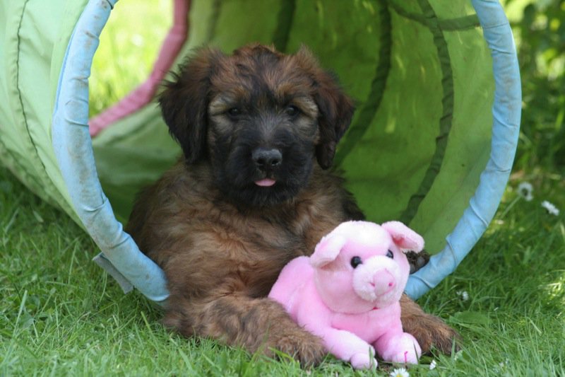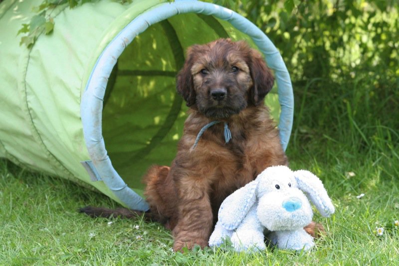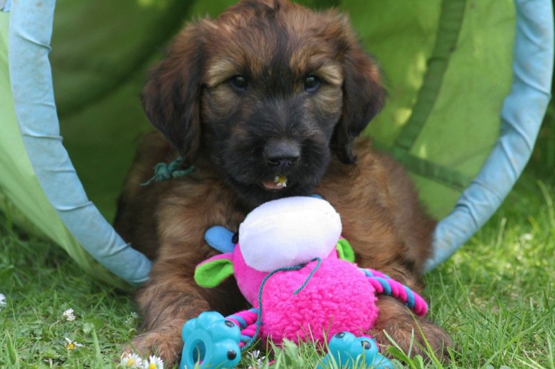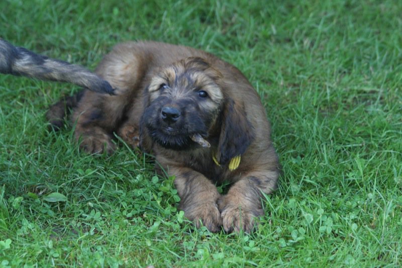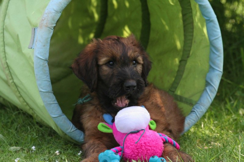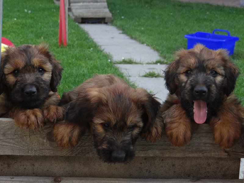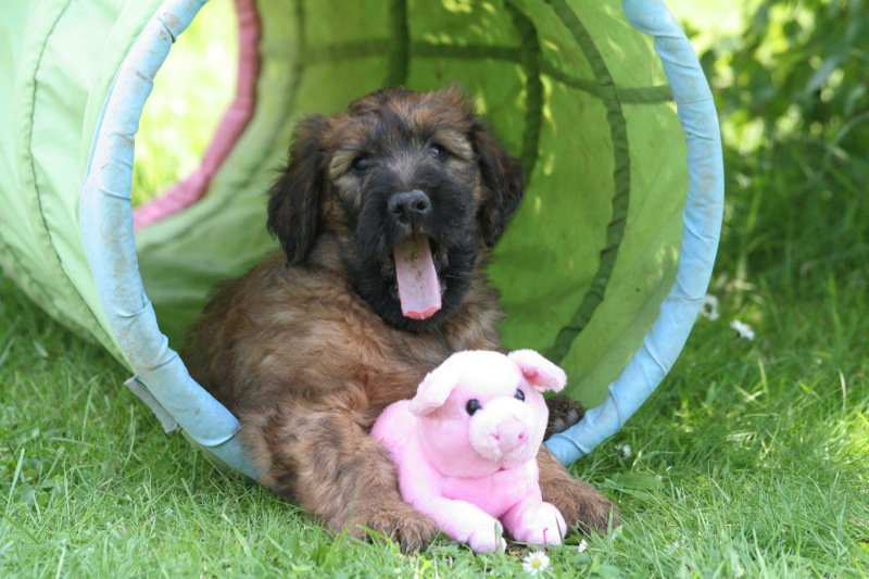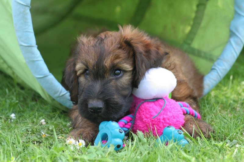 Es sind sehr kontaktfreudige, weltoffene Welpen. Alles Neue wird begeistert mitgemacht, selten zeigen sie Angst. Selbst der Trecker wird, wenn auch mit etwas Abstand, neugierig beäugt. Und dem kleinen Rasenmäher jagen sie furchtlos hinterher.