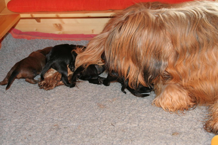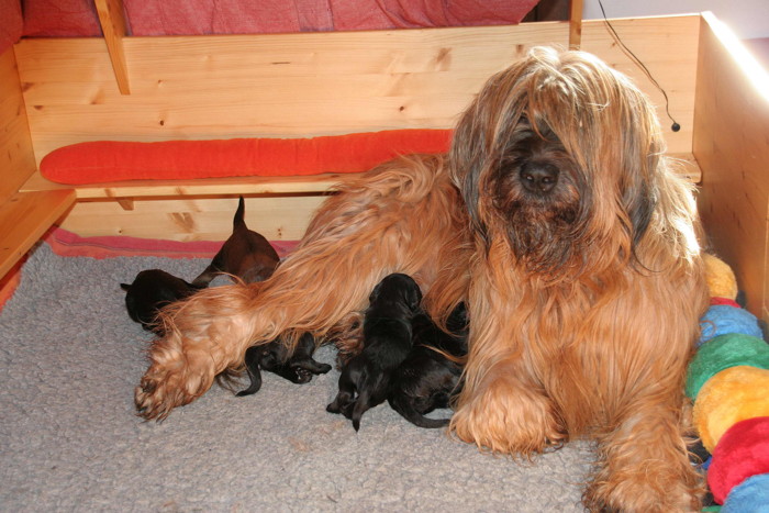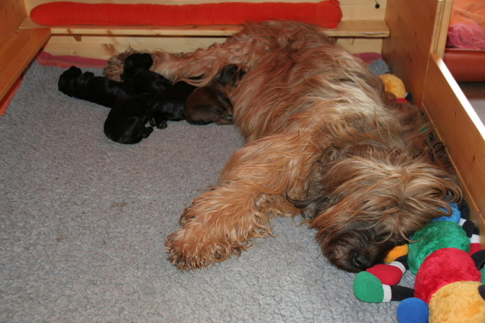 Mara lässt es sich gut gehen, mit 5 Welpen ist die Aufzucht durchaus überschaubar und sie geniesst es offensichtlich bei ihren Welpen zu liegen.