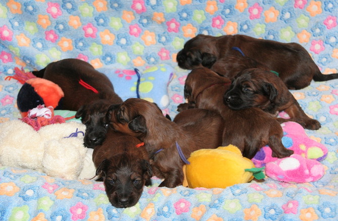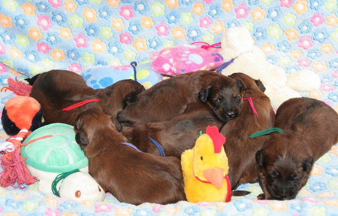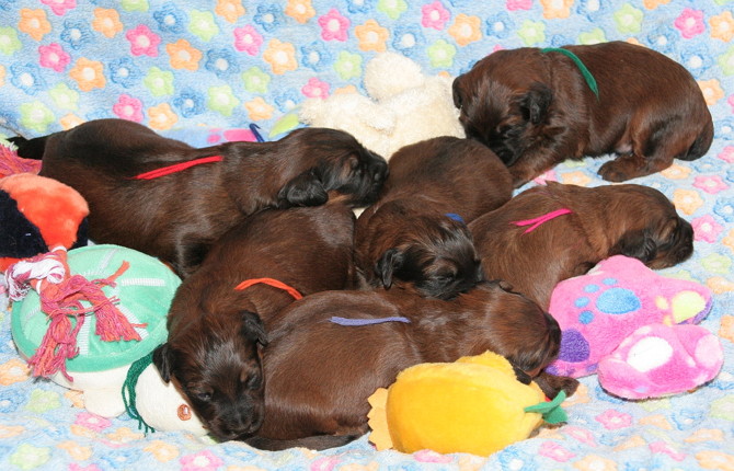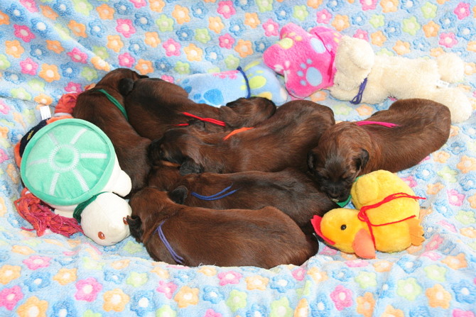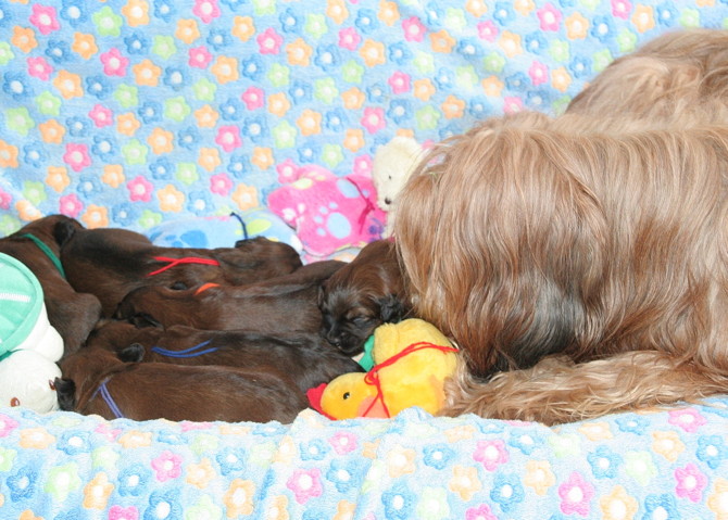 Unser U-Wurf ist nun zwei Wochen alt. Die Augen sind schon offen, die Mäulchen auch, wie man an den Gewichten sieht ... und nur die Beinchen haben noch ein kleines Koordinationsproblem, aber es geht schon ganz ordentlich voran. Onawa ist immer noch vorrangig Mutter und kümmert sich Non Stopp um ihre Hexlein.