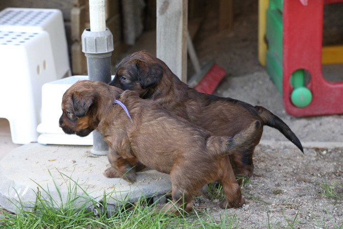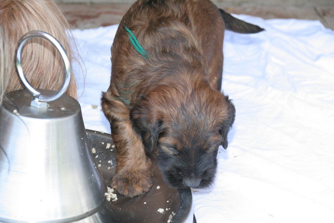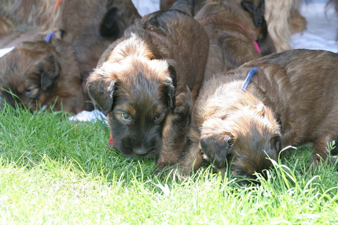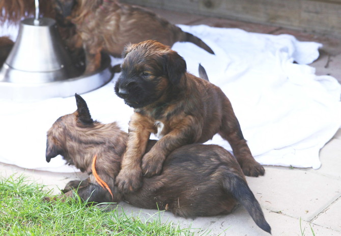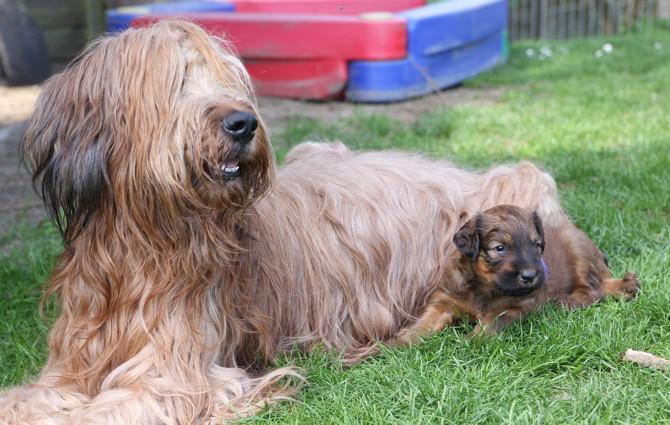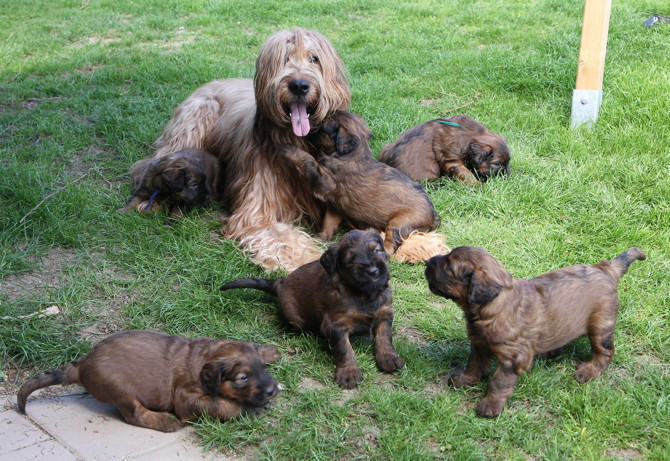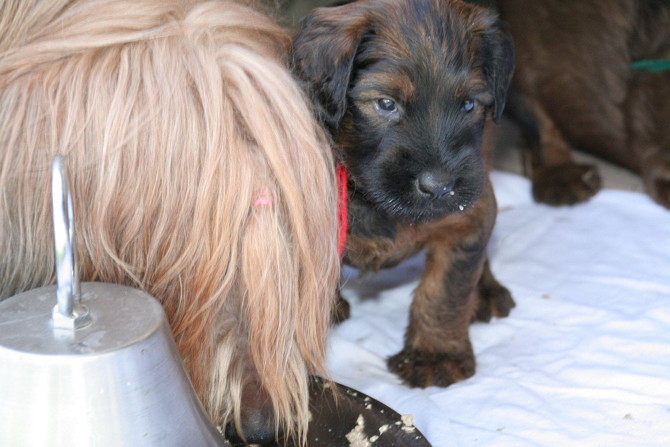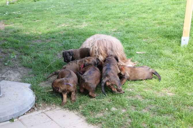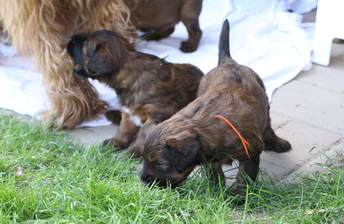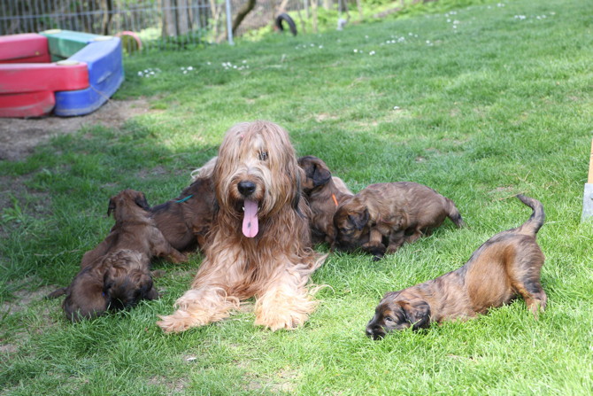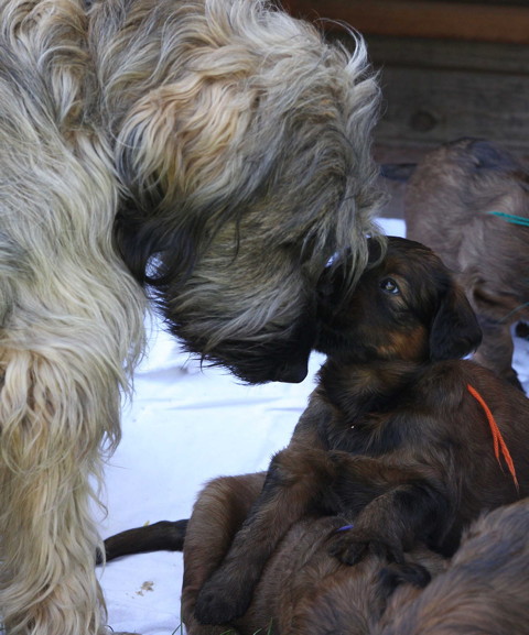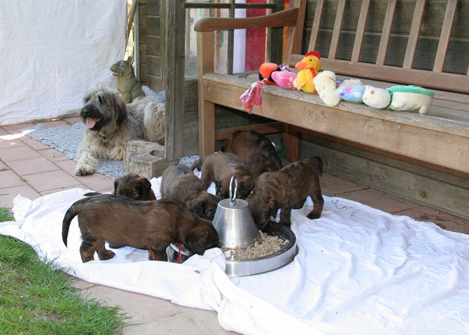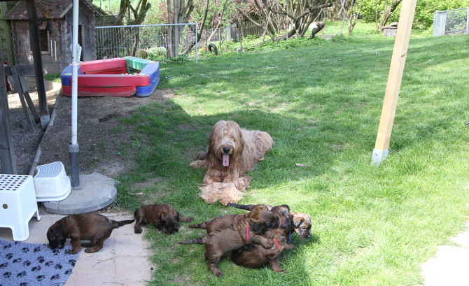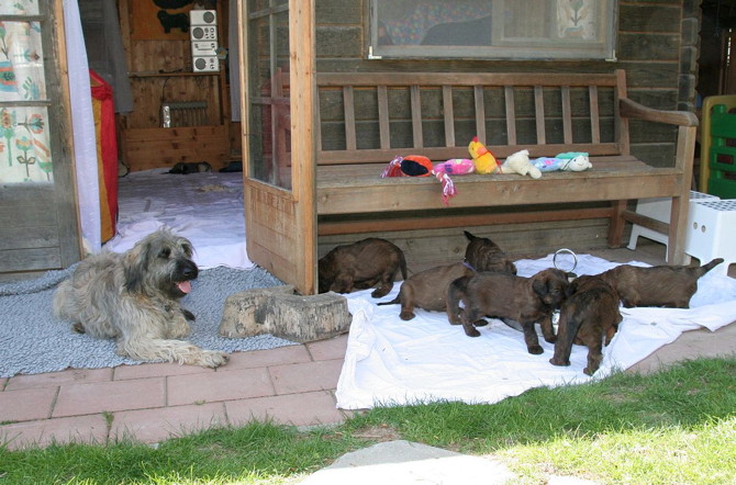 Derweil haben Mama Onawa und Gos d'Atura Tante Troll ein wachsames Auge auf die kleinen Eroberer gehabt. Kein Hexlein durfte zu weit weg, dann hat sich unsere Trolli gleich die 'LalüLala' Feuerwehrsirene aufs Haupt gesetzt, und kurz gebellt, dann kam gleich Mama Onawa und hat ihr Kind wieder in Richtung Hütte geleitet. Wenn dann zu viele von den Eroberern auseinander stobten, wurde Obergouvernante 'Elke' herbei gefiepst ... so dass ich den Nachmittag damit verbracht habe, Hexenkinder in einem grandiosen Radius von ganzen drei Metern einzusammeln. Unsere kleine Briardhündin Mimi hat sich das Ganze lieber in einem gewissen Sicherheitsabstand angesehen. Solange die Welpen brav zusammen waren, war sie ganz mutig und hat sich den 'Ungeheuern' auf einen Meter genähert. Aber wehe diese 'Tiere' sind auf sie zu gelaufen, dann hat sie sich schleunigst in Sicherheit gebracht. Das wird wohl noch ein paar Tage dauern, bis sie sich mit den kleinen Hexenkindern anfreundet. Troll dagegen, darf als Einzige immer bei ihnen sein und nimmt ihre Aufgabe als 'Assistenz der Geschäftsführung' mehr als ernst. Und Onawa ist deutlich erleichtert, dass sie so eine kompetente Hilfe hat.