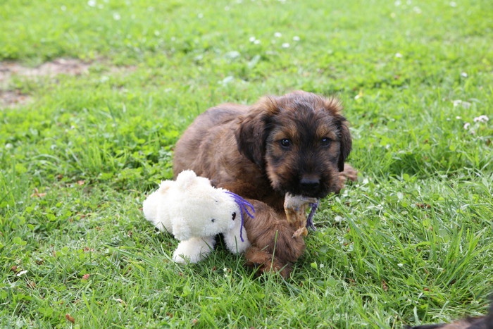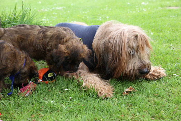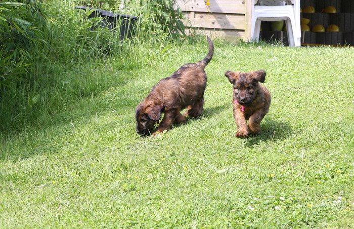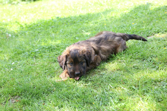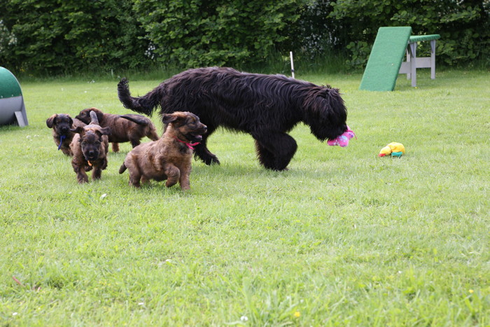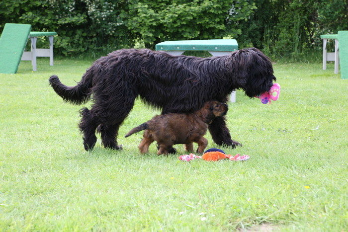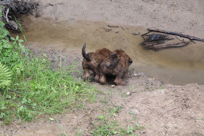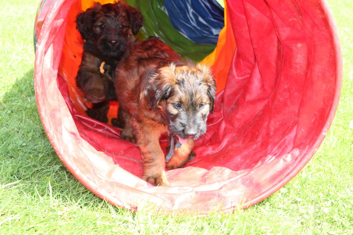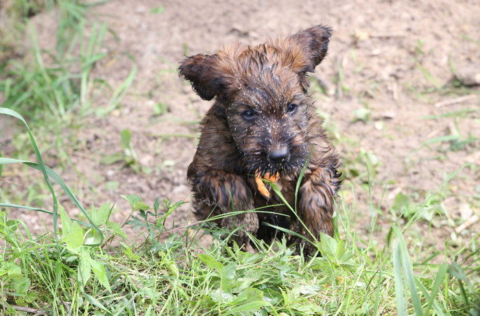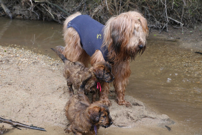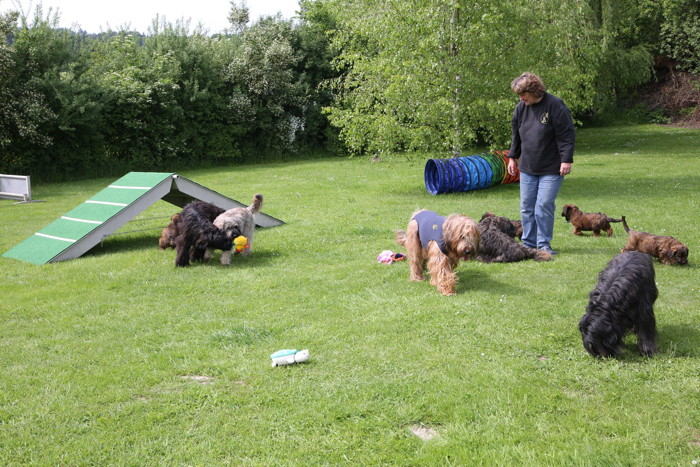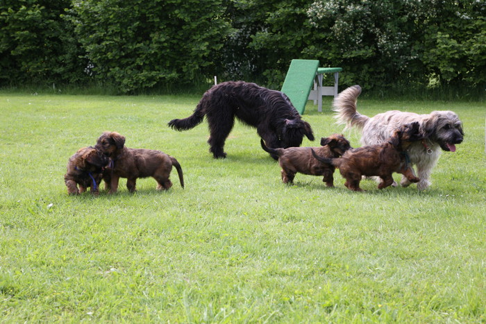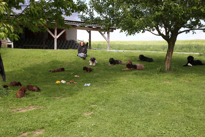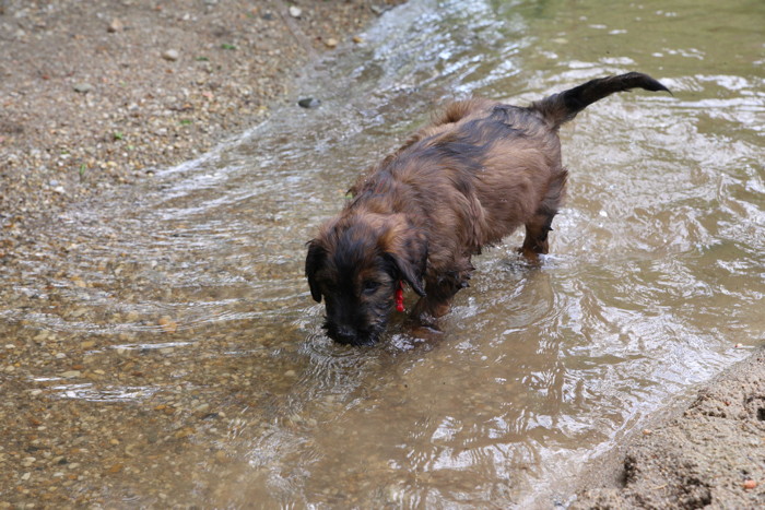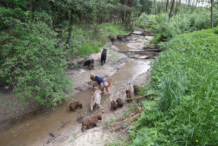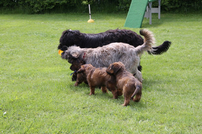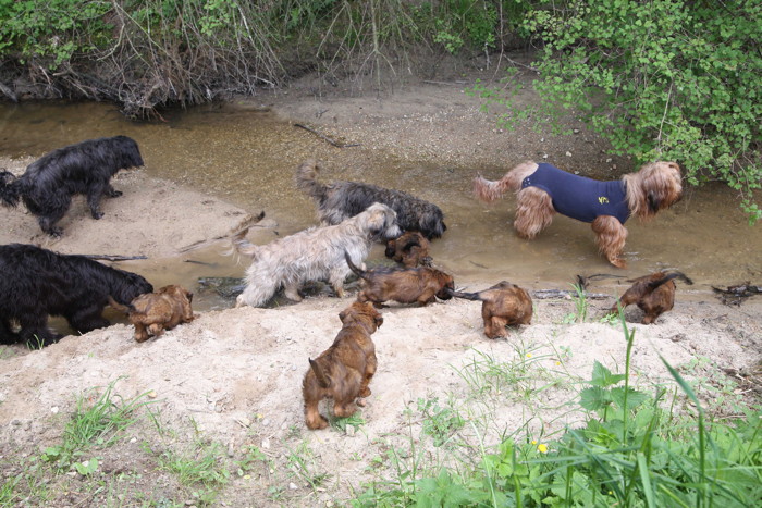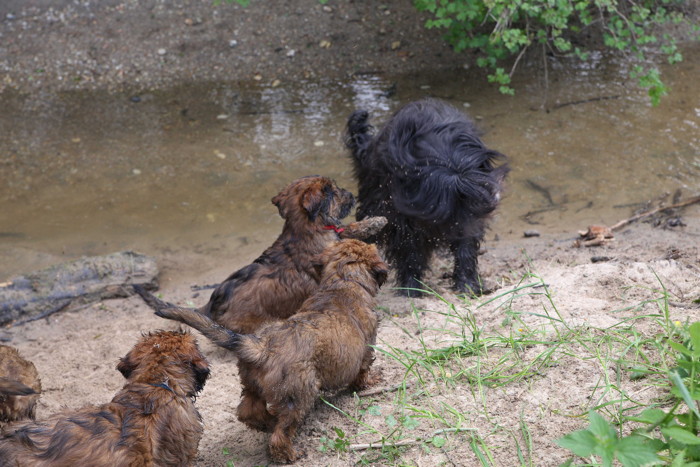 Ihren ersten großen Ausflug haben sie souverän gemeistert. Sie haben unsere Hundeplätze erobert und sind gleich mit uns an unseren Bach gelaufen um sich begeistert in die 'Fluten' zu stürzen. Superhexenkinder!!! Urmel hat sie im Buddeln unterrichtet, Cobold hat ihnen gezeigt wie man Stöcke abbeisst, Trolli und Mimi sind mit ihnen durchs Wasser gerast und Mama Onawa hat immer aufgepasst und sie umsorgt. Mara und Inschi haben derweil die Keksreste auf dem Hundeplatz verzehrt und fielen im Fach 'Unsinn' gottseidank aus.