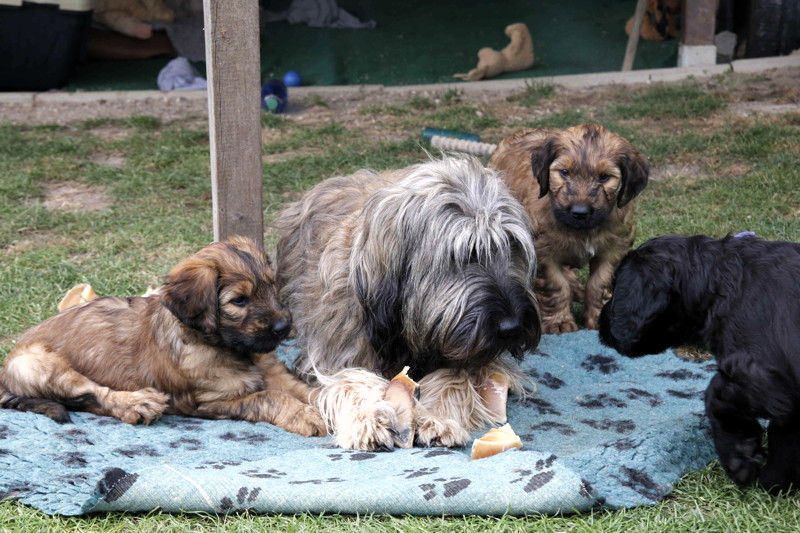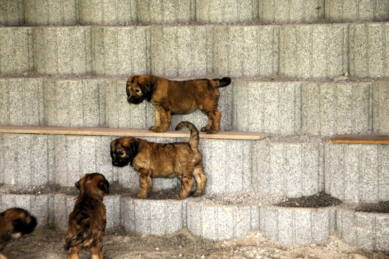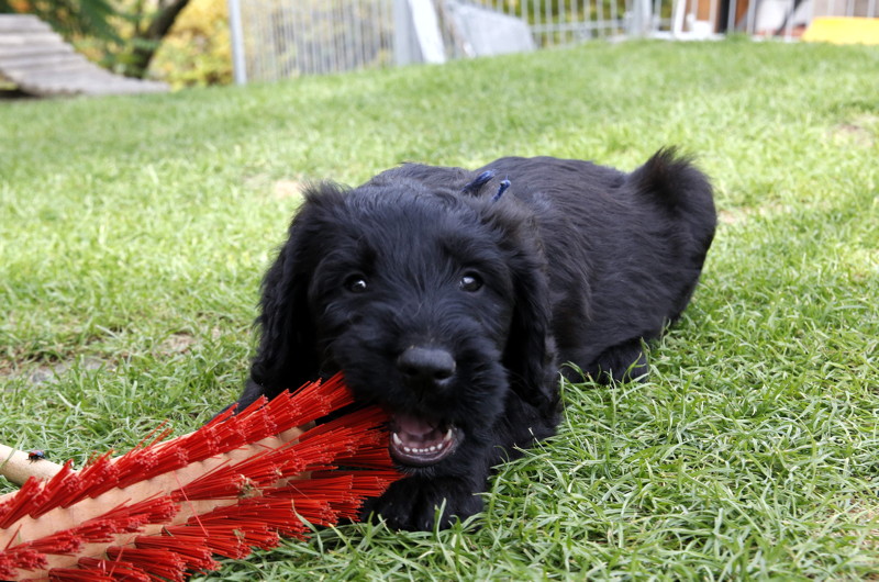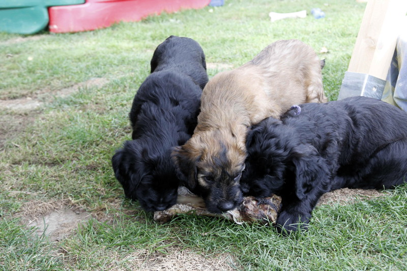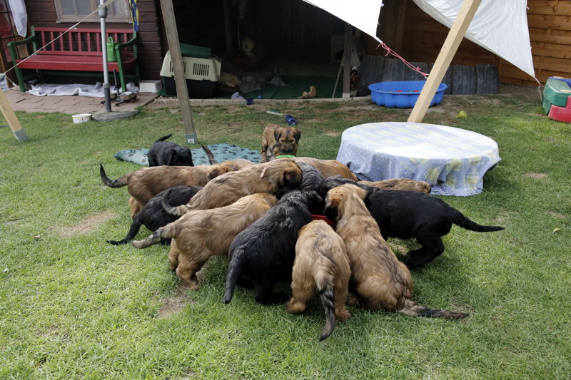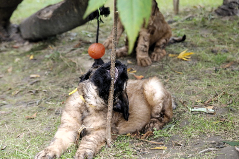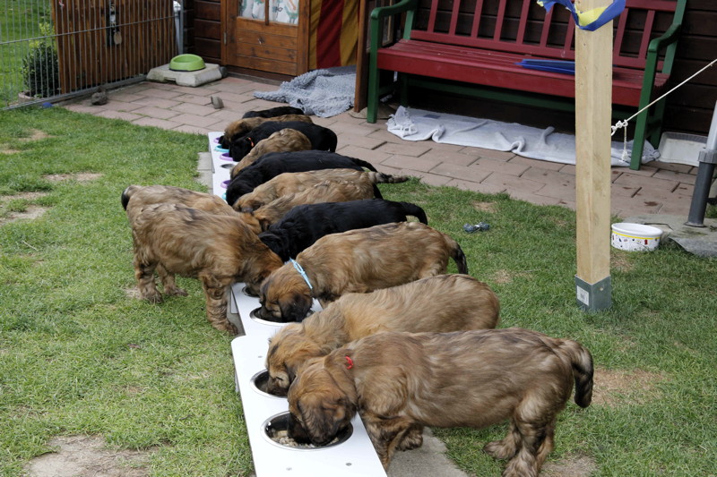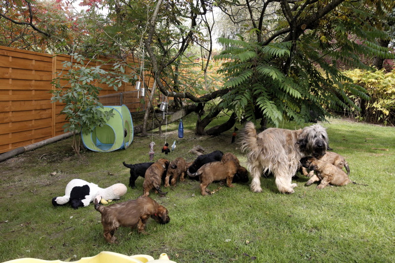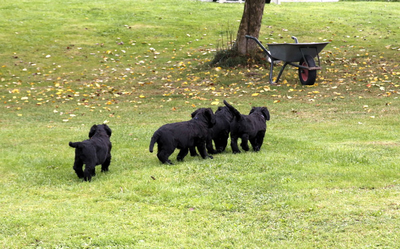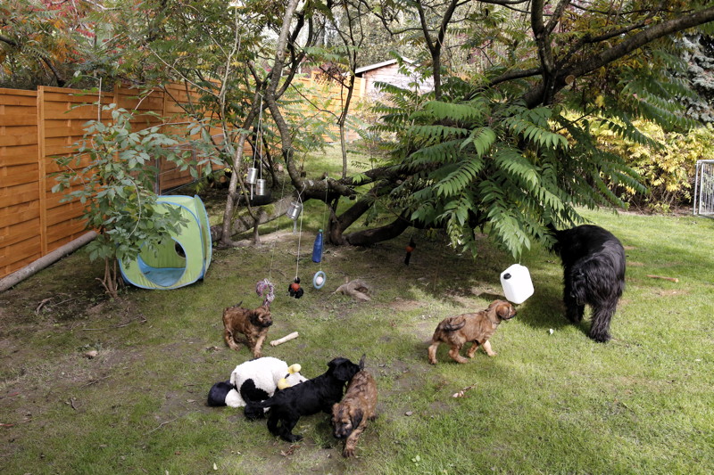 Sie sind schon richtig gut im Manipulieren von Menschen (Kopf schiefhalten und schon lächeln sie), im Ausbrechen (so eine Welpenabsperrung ist doch easy zu überklettern), im Tonhalten (man muss nur langanhaltend Heulen dann kommen die Züchter angerannt), im Schmusen (sie sind ja soooo niedlich), im Waldroden (Essigbäume sind nur der Anfang in unserer Baumfällkarriere), im Graben (sie wollen alle später mal Höhlenforscher werden und graben sich schon mal ins Thema ein), im Angriff (gemeinsam stürzen wir uns bellend auf gefährliche Dinge wie herabfallende 'Riesenblätter'), im Napfleeren (schliesslich wollen wir kugelrund zu den neuen Besitzern kommen).