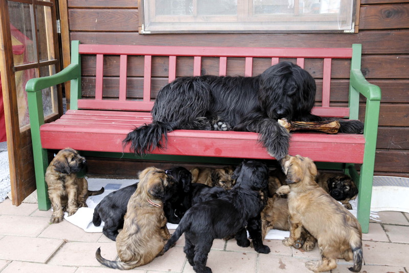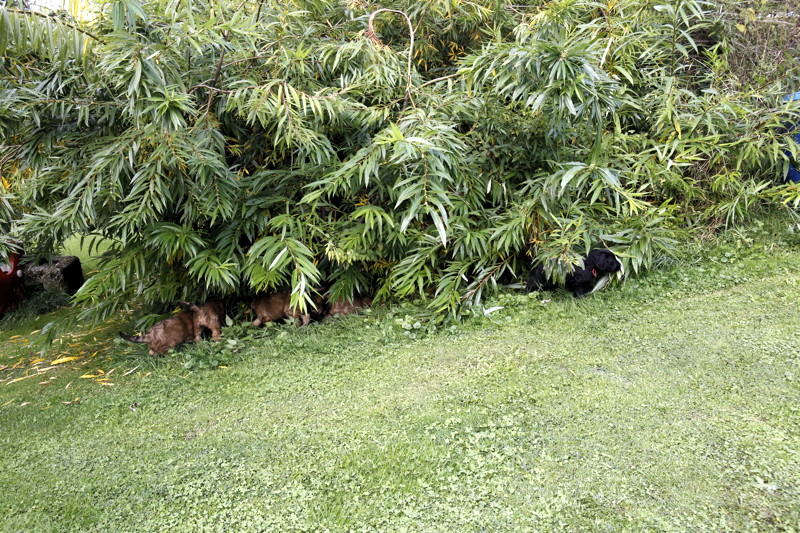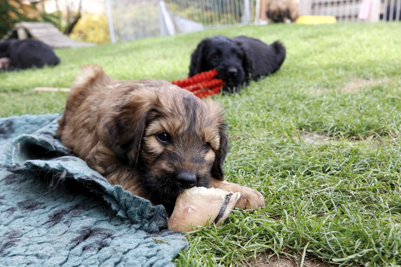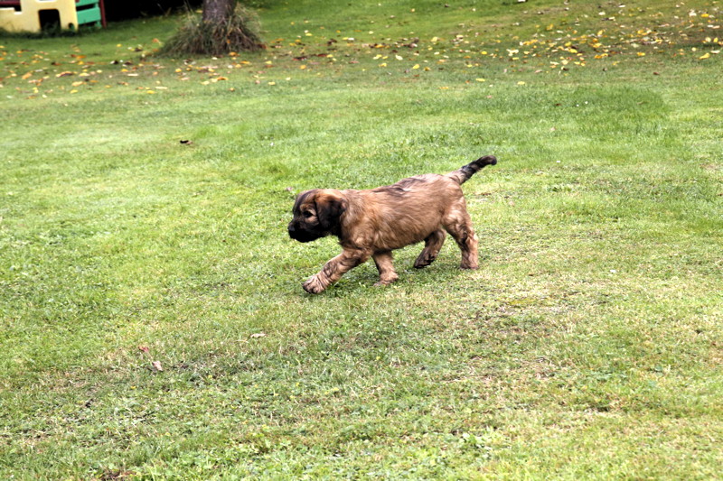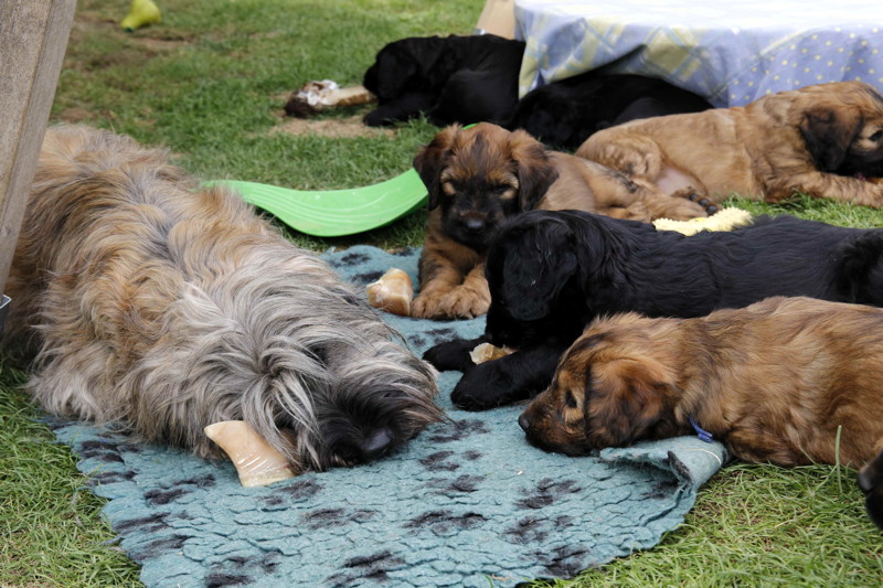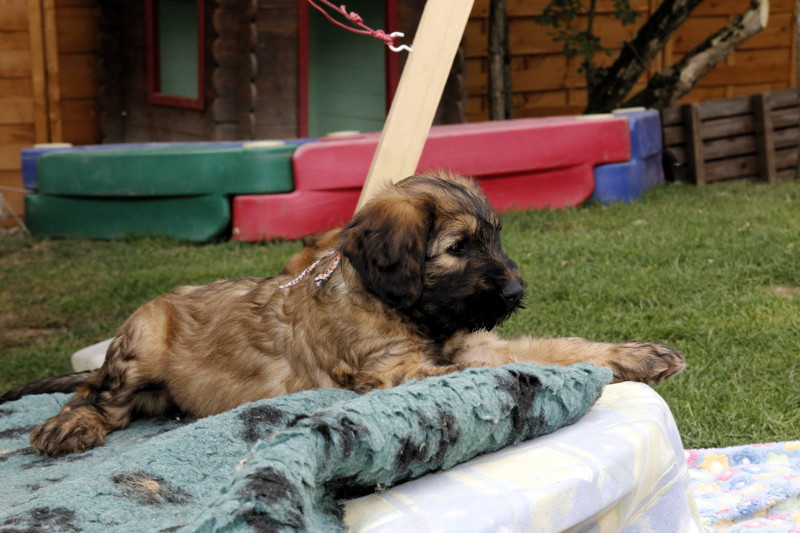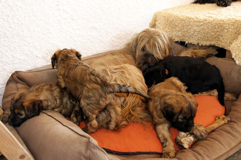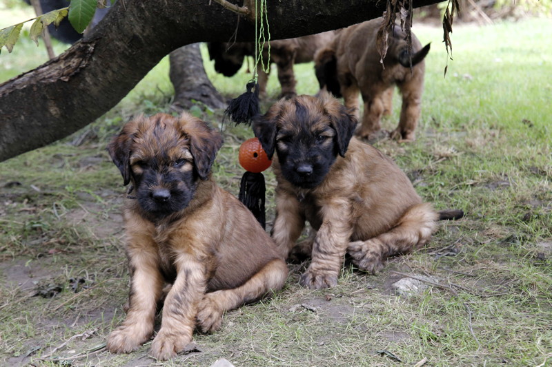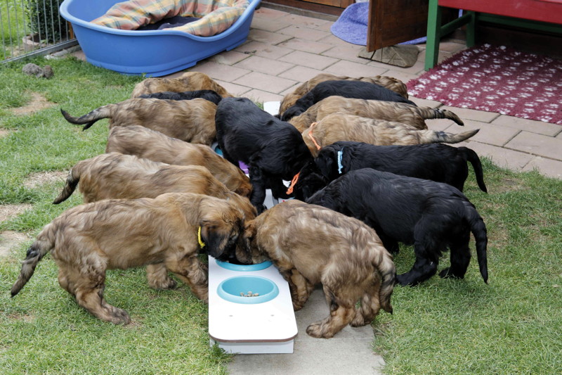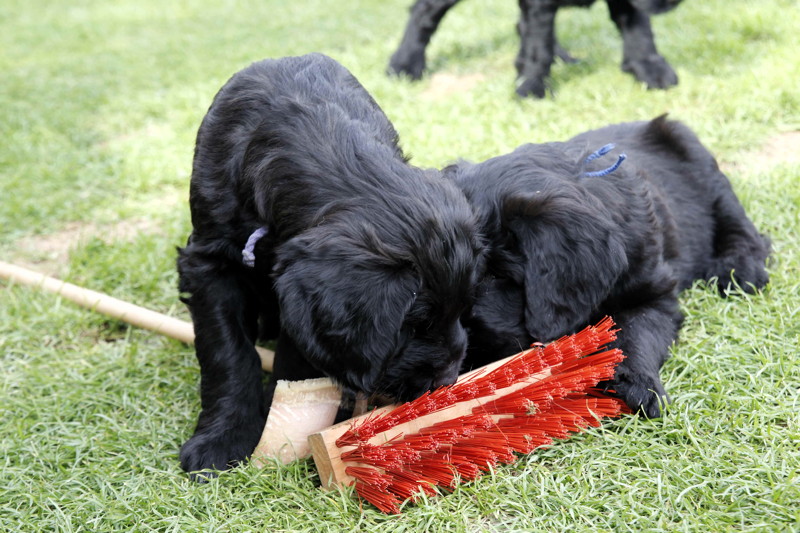 Sie sind schon richtig gut im Manipulieren von Menschen (Kopf schiefhalten und schon lächeln sie), im Ausbrechen (so eine Welpenabsperrung ist doch easy zu überklettern), im Tonhalten (man muss nur langanhaltend Heulen dann kommen die Züchter angerannt), im Schmusen (sie sind ja soooo niedlich), im Waldroden (Essigbäume sind nur der Anfang in unserer Baumfällkarriere), im Graben (sie wollen alle später mal Höhlenforscher werden und graben sich schon mal ins Thema ein), im Angriff (gemeinsam stürzen wir uns bellend auf gefährliche Dinge wie herabfallende 'Riesenblätter'), im Napfleeren (schliesslich wollen wir kugelrund zu den neuen Besitzern kommen).