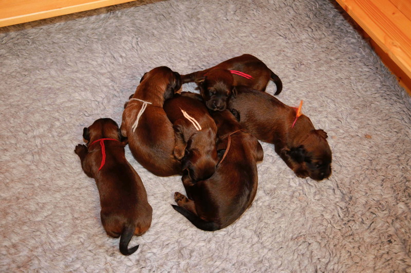 Alle nehmen unendlich gut zu und da die Babywaage streikt, musste mal wieder der Thermomix herhalten. Die 1kg-Marke hat der Rüde braun nach einer Woche und einem Tag geknackt ... und bis auf Lachs und Rot sind die anderen gewichtsmäßig nahe beieinander. Aber auch unsere 'kleinen' Hexenkinder wiegen schon über 700g und sind, da leichter und wendiger, ziemlich schnell, wenn es ans Gesäuge geht.