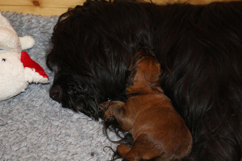 Ab jetzt wird es so langsam spannend. Deutlich unterscheiden sie schon zwischen Mama Mimi und den restlichen Rudelmitgliedern, die ab und an den Kopf neugierig in die Wurfhöhle stecken. Der Versuch bei Tante Troll Milch zu bekommen blieb ein wenig ergebnislos, obwohl sich Trolli alle Mühe gab um die Hexlein bei sich zu behalten und zu säugen. Leider blieb diese Quelle trocken. Aber kuscheln ist auch schön und so genießt Troll es, auch ein wenig Ersatzmama zu sein.