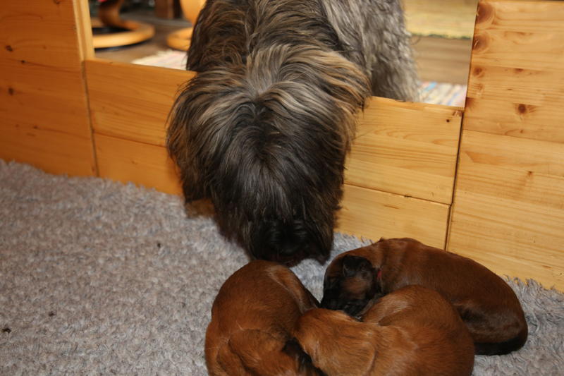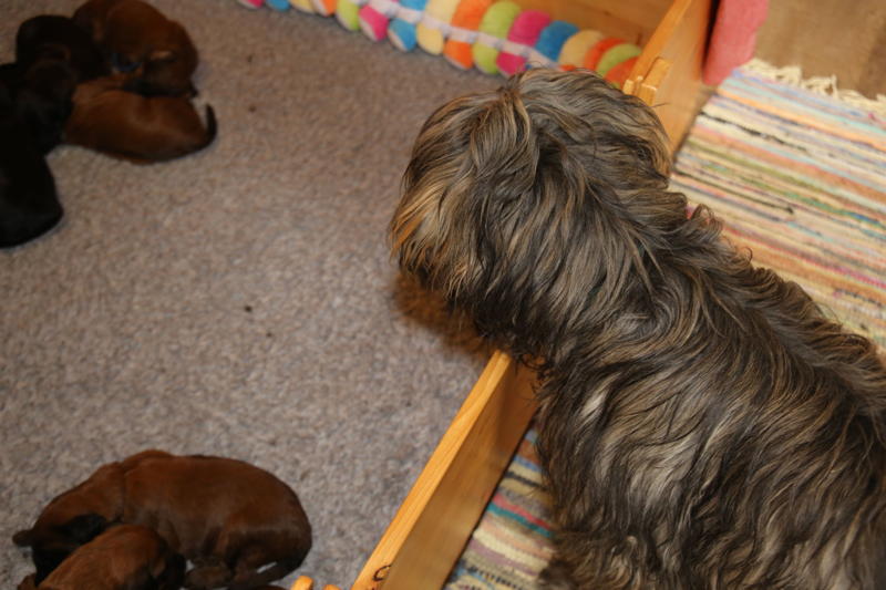 Mimi ist total entspannt, wenn unsere Trolli ein wenig mithilft und die Kleinen putzt. Die anderen dürfen zwar reinschauen aber das Betreten der Wurfhöhle ist noch verboten.