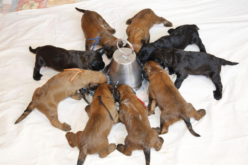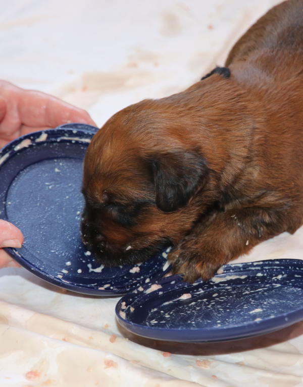 Nun sind es kleine Hunde. Schon gut koordiniert haben sie sich in die 'große Welt' getraut. Den Schritt aus der Wurfhöhle haben sie zunächst ganz vorsichtig gewagt. Aber von Tag zu Tag wurden sie mutiger und bald hatten sie das neue Terrain erobert. Das erste Essen war ein wenig gewöhnungsbedürftig ... aber schnell haben sie herausgefunden, dass es gar nicht so schlecht ist.