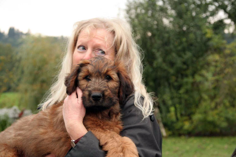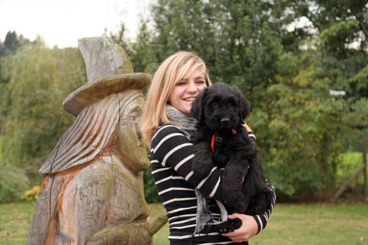 Ole sollte eigentlich auch eine Hündin werden. Da es bei den 5 Weidners nach dem Tod von ihrem Briardrüden Balou viel zu ruhig geworden war, musste wieder so ein Hexlein her. Unsere Hündinnen waren schon lange vorbestellt und so wurde es eben ein Rüde. Dieses Mal ein schwarzer Rüde mit dem sie nun wieder viel Spaß haben und der eine Menge Leben ins Haus bringt. Unser 'Graue' war schon hier ein kleiner temperamentvoller 'Charmebolzen' und alle Weidners sind (meistens) begeistert von seinen Aktivitäten.