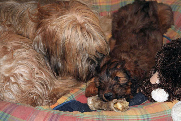 Onawa ist erst gar nicht ausgezogen. Wir haben Morgaine versprochen dass auch sie mal ein Kind behalten darf und so wohnt das kleine Monster weiterhin auf dem Hexenhof. Unsere kleine 'Gelbe', nicht unbedingt der 'Hingucker' mit ihrem Kurzfell und dem Watschelgang, hat sich schon recht früh in unser Herz geschlichen. Mit viel Temperament und Energie ausgestattet wollte sie einfach bleiben um unser doch recht ruhiges Briardrudel zu mobilisieren. Morgaine ist hoch erfreut, dass sie eine Hexe behalten durfte und so ist unser Hexenhof mal wieder um 4 Pfoten und eine Menge Power reicher geworden.